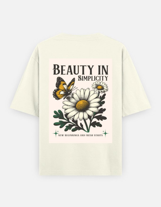 This serene and stylish tee features a vintage botanical illustration of daisies and a monarch butterfly, paired with the timeless message: “Beauty in Simplicity.” Set against a soft cream backdrop, it radiates warmth, peace, and renewal.