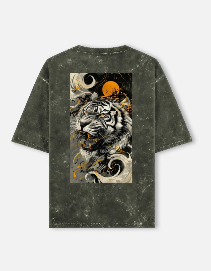 Unleash untamed power with this forest green acid-washed tee, featuring a ferocious tiger engulfed in fiery orange accents beneath a burning moon.